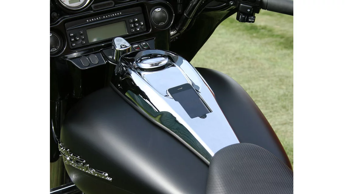 With the DashLink installed, all of the wiring is hidden for a clean appearance. The DashLink features not only a power connection, but a line-level audio output for integration with your bike’s existing sound system. You can also take advantage of the iPhone’s Bluetooth capability to connect to earphones or a a headset while riding. On FLH and FLT models, you can even control the volume using the bike’s stock handlebar controls.