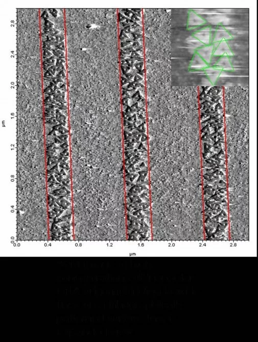 The researchers say such a technique may provide a way to reach sub-22 nm lithography on surfaces compatible with today’s semiconductor manufacturing equipment. The technique allows for DNA nanostructures such as squares, triangles and stars to be prepared with dimensions of 100-150 nm on an edge and a thickness of the width of the DNA double helix.