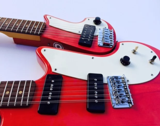 Both guitar sections feature a 22 fret Gibson scale bolt-on neck fashioned from reclaimed old growth Port Oxford cedar and topped by rosewood, a Gotoh hardtail bridge and Gotoh tuners. The main guitar sports P90-type pickups from Brandon Wound Pickups, selected via a 3-way pickup, while the lower mini guitar packs a humbucking pickup. The instrument will come in a choice of red, yellow, blue, burst or natural finishes, and models with a 6-string main guitar and a 12-string mini will also be made available.