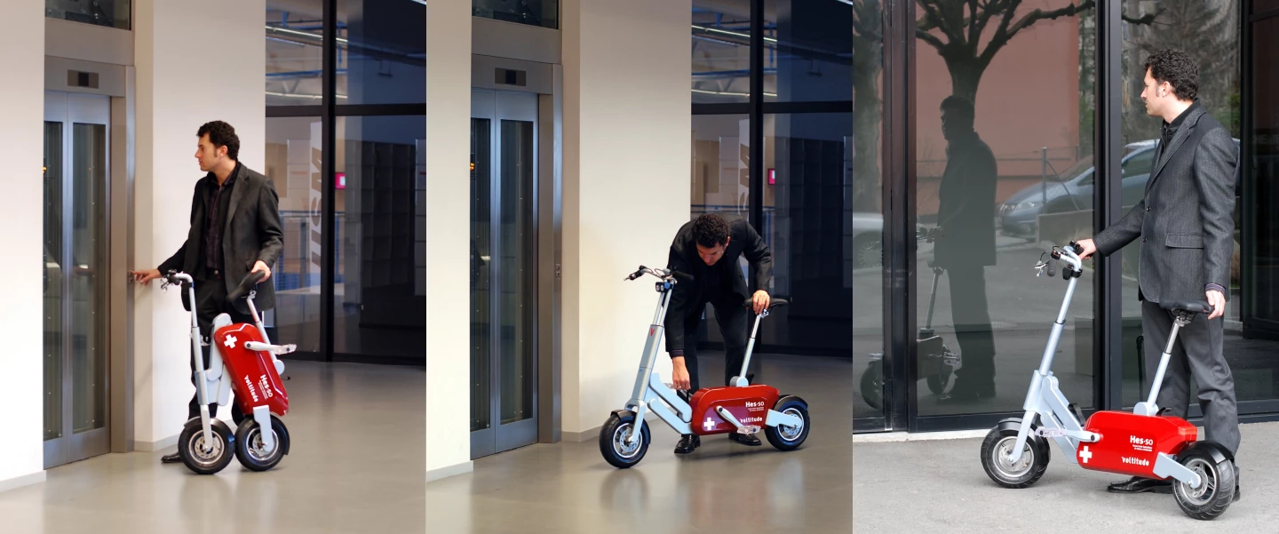 Yet another variation on the theme is the Voltitude - a folding pedal-electric assist scooter which can fold or unfold in one second, and rolls alongside you in lifts, airports and offices.