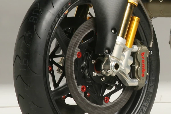 The Desmo's magnesium rims and superb metal discs are replaced by carbon fiber wheels and ceramic matrix composite discs – so unsprung weight will be kept at a minimum and stopping power will be absolutely phenomenal once they're warm.