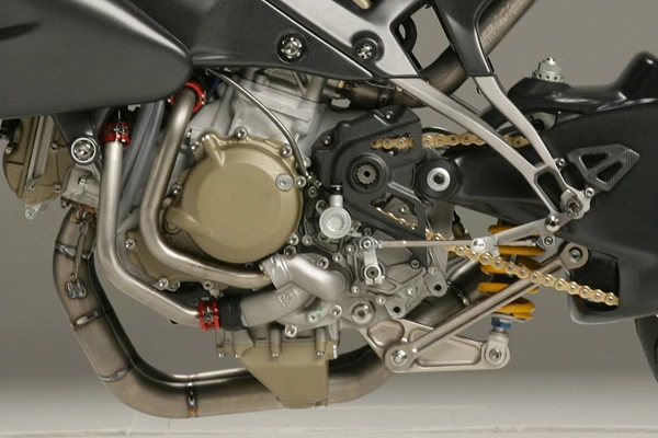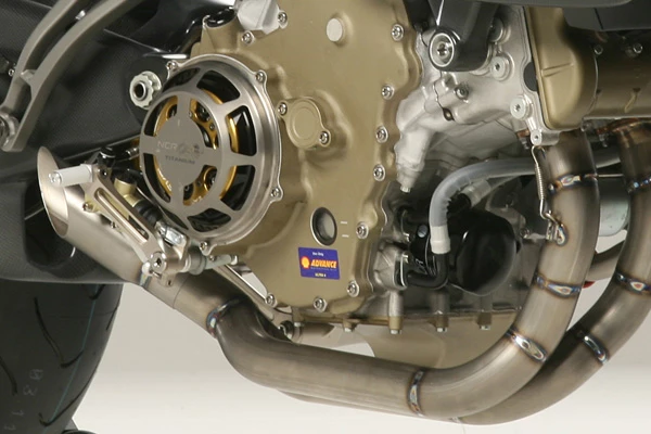 In the engine department, the roaring V4 powerplant gets an NCR Corse racing slipper clutch and a lightened gearbox. The top-shelf stock Ohlins suspension is replaced by, well, even topper-shelf Ohlins suspension, the same stuff they're using in MotoGP this year as opposed to 2006, the last year the Desmosedici 990cc beast raced in the top class.