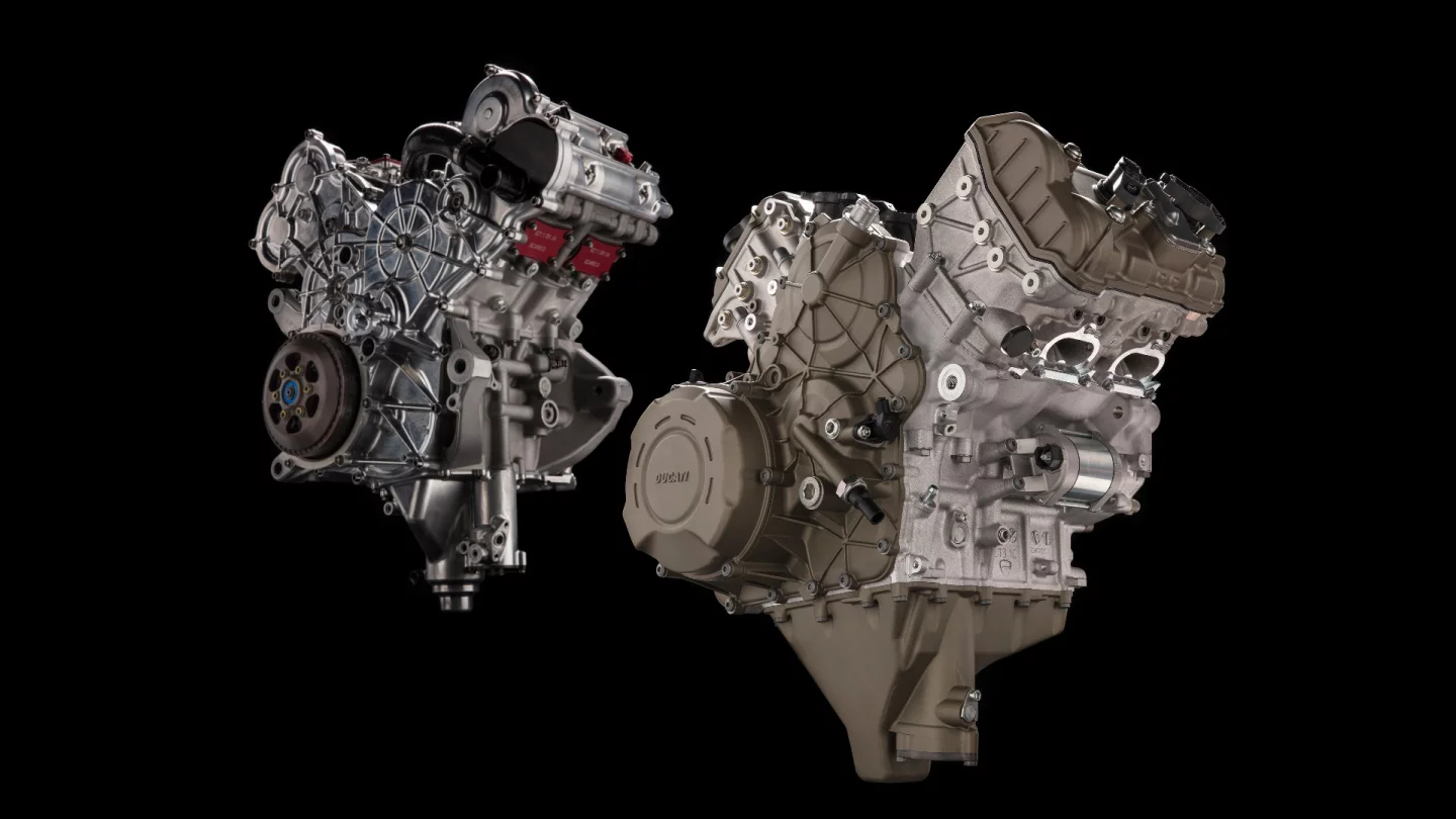 The 210 hp 90° V4 revs to 14,000 rpm, is rotated rearward by 42°, the crankshaft is the counter-rotating type, and as it shares the same 81 mm cylinder bore as the Grand Prix prototype, it has a near identical top end. The pic below shows the two engines together.
