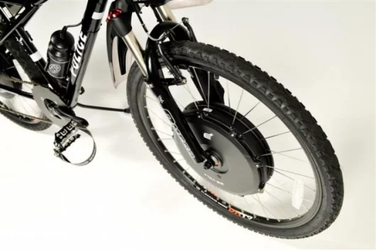 The E+ Electric Bike is available in six styles of bike that are all a variation on a hard-tail mountain bike. The E+ comes standard with a 750 watt BLDC rear hub motor but there is a high torque 85 Nm 1kw hub motor as an upgrade option. Both hub motors have built in inverters so there’s one less box to find mounting space on the bike frame for. The front hub mounted battery pack is something we’ve never seen before on an e-bike. The internal layout is very similar to a hub motor with the stationary inner structure (called the stator) attached to the axle while the outer housing is attached to the rim via spokes and rotates as part of the wheel. Thirty NiMH battery cells are arranged in six groups of five cells arranged in a polygon layout parallel to the axle and mounted on the stator. The battery pack puts out 36 volts at 9 amp hour giving a battery capacity of 324 watt hour. (0.324kw/hr). No electric only range is quoted as this is very dependent on terrain, how much you pedal and the amount of regeneration possible but each battery charge should give between 20 and 40 miles (32 – 64 km). A full charge from a 110v wall socket will take four to six hours and cost about $0.03.