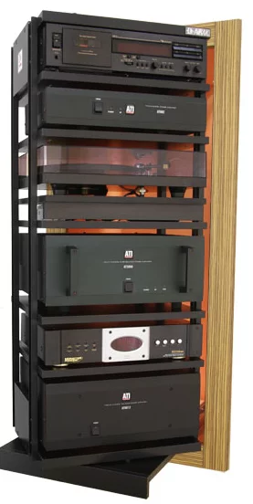Avrak has two basic types of systems – free-standing and built-in. Both types of units come with fully adjustable shelves that slide forward (up to 19 inches) and freely rotate to expose the rear of the components for easy reconfiguration or disconnection, etc.