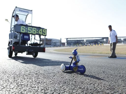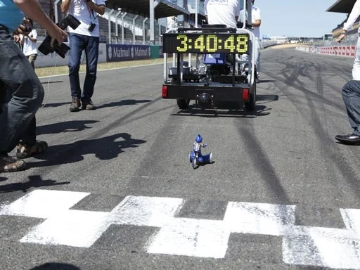 Sure, the traveling speed of 0.6mph (1kmh) was a little slower than those normally seen at France’s Le Mans circuit but this test was all about going the distance. Pedaling a miniature tricycle, Mr Evolta followed an infrared beam from a lead golf cart. The robot completed 5.6 laps of the circuit, which equates to 14.82 miles, over the 24-hour period.