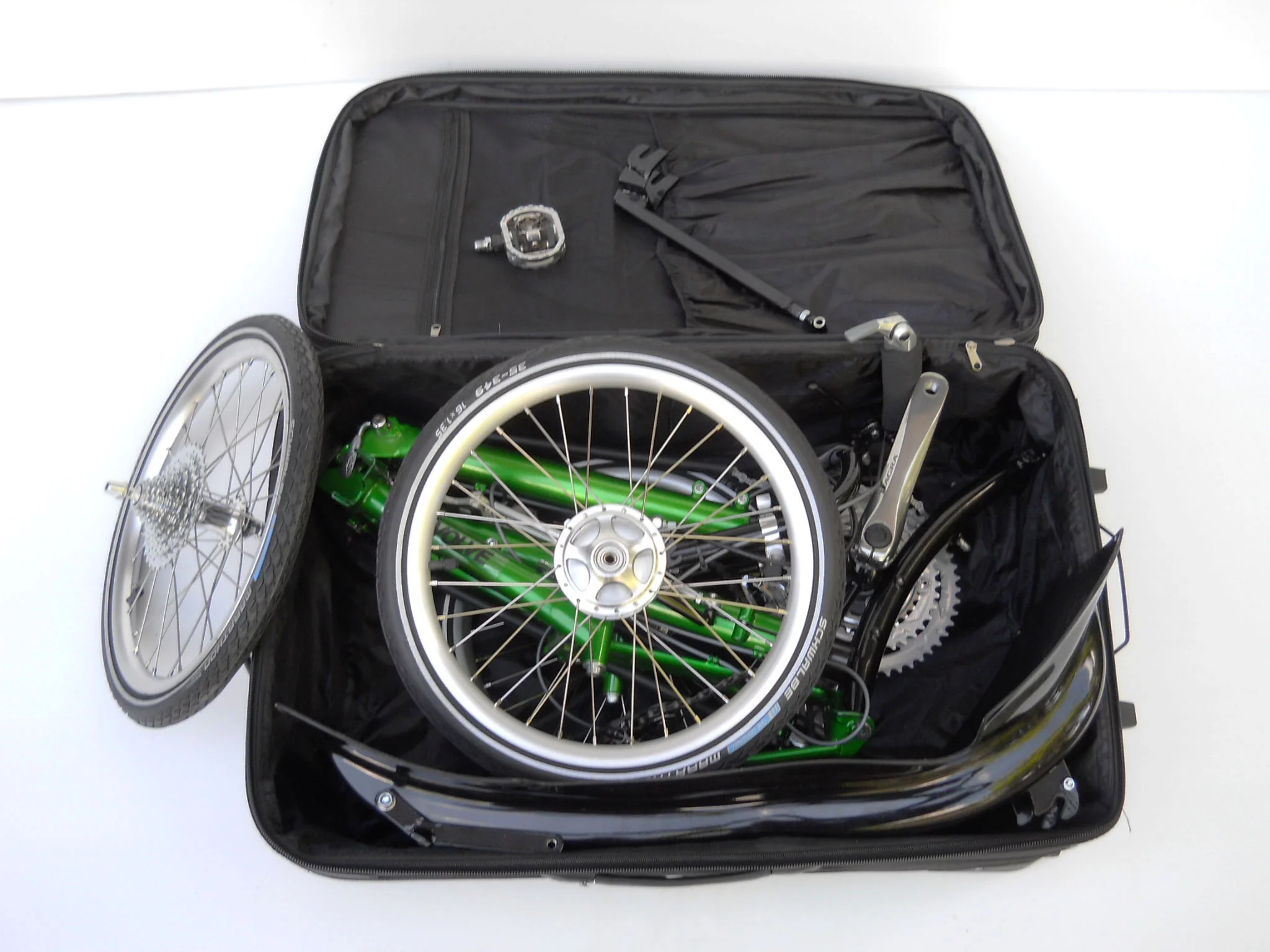 The Evolve trike can reportedly be folded into the back of a smart car (the litmus test for whether or not things are small) in under 13 seconds, or into an oversize suitcase in about 18 seconds - in that case, with the back wheel removed. If you just want to fold it part way, enough to get it through a doorway, that can be done in six seconds.