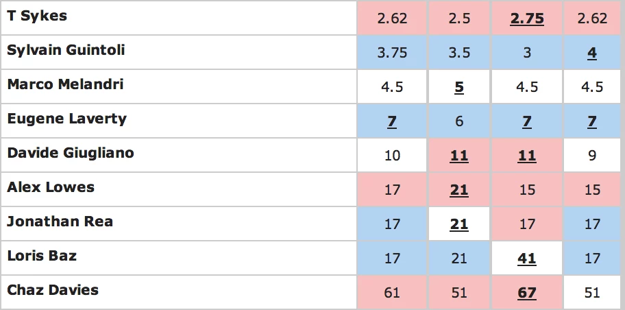 Most of the field is comprised of the usual suspects, with Tom Sykes, Sylvain Guintoli, Marco Melandri, Eugene Laverty and Davide Giugliano the most likely to take the championship at the end of the season, at least as divined by the bookmakers.