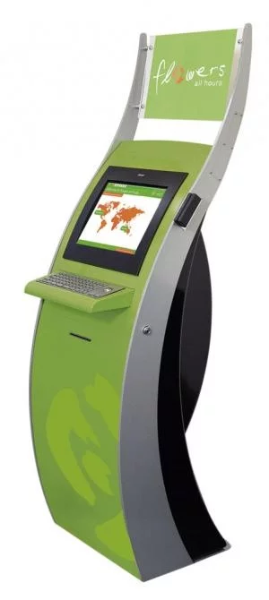 The customer uses a touch screen interface to purchase flower arrangements directly from a machine or arrange to send an order anywhere world-wide.