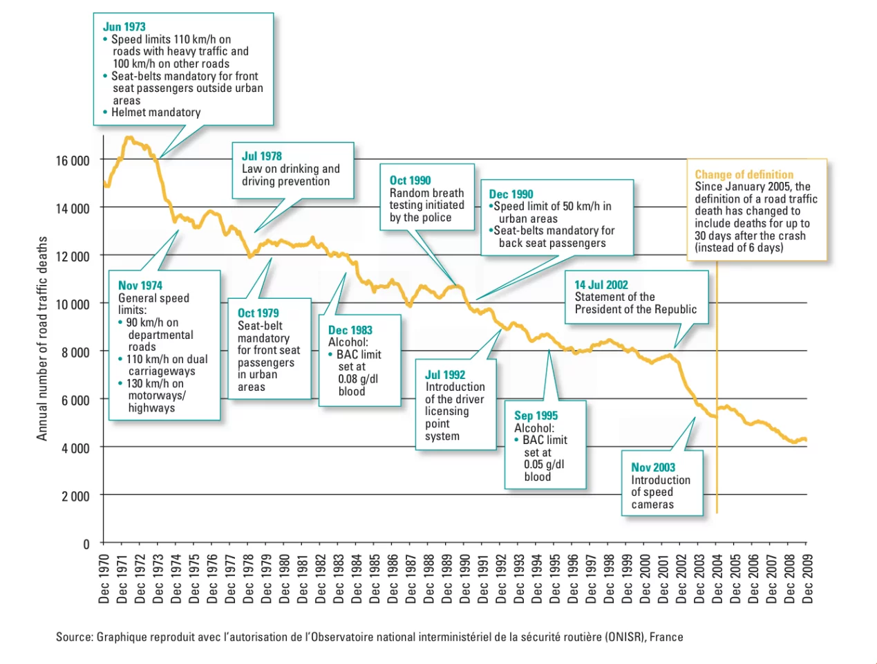 The French Government may have been a bit late in fully embracing the concept of road safety, but its spectacular rise towards world's best practice from its former mediocrity indicates that France now means business. Little more than a decade ago, France had one of the worst fatality rates in the civilized world. Since 2001 though, it has systematically worked its road toll downwards with legislation and logical safety measures aimed at reducing speed.