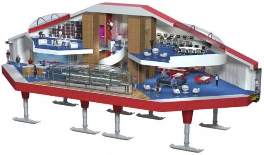 An upper deck houses a TV lounge, library and office area. A feature helical stair to this area climbs through an atrium glazed with high performance translucent panels. In the summer, the space will be filled with diffuse light. In winter, blinds will act as a screen for color change lights that will emulate the changing light in the day of a more temperate climate.