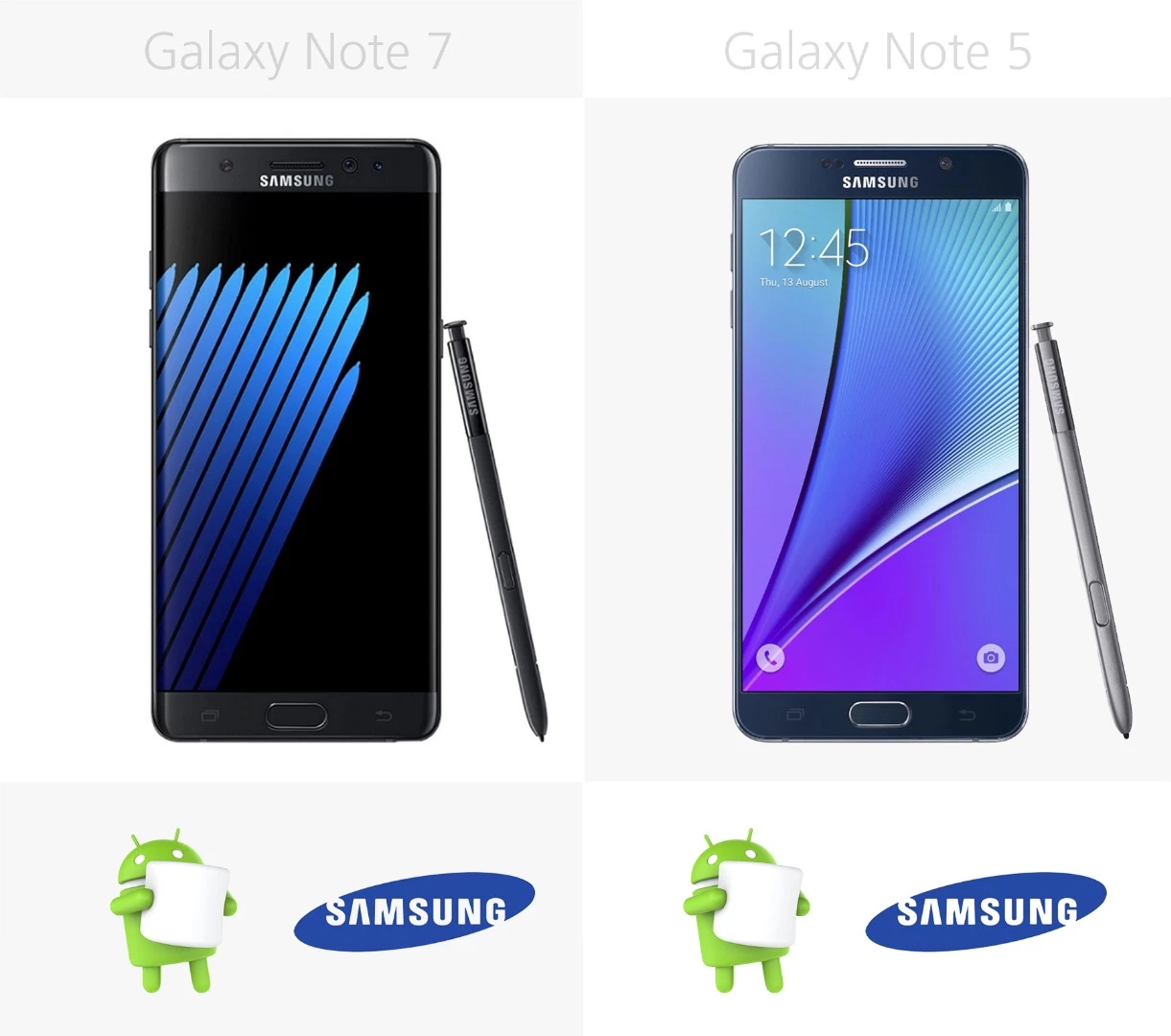 Sizes are very similar, with the Galaxy Note 7 coming out a pinch taller and narrower. It also measures 4 percent thicker than the Note 5.