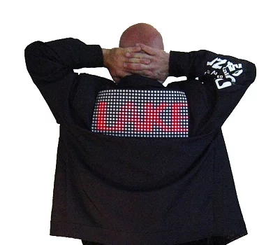 The illuminated jackets run on three NiMH rechargeable AA batteries and last for 8 hours (Duracells last for twice that long). The current jacket has a 16x16 pixel display screen on the front (7.5cm x 7.5cm) and a 16x32 pixel display screen on the back (15cm x 31cm). The upper limit for wearable displays currently set in software is 100,000 of the larger panels, enough to cover a football field and all the people in the stands.
