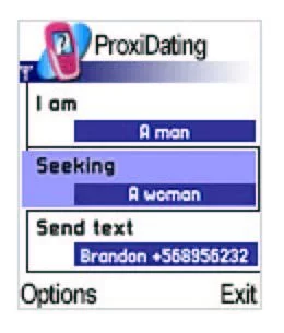 The proxidating service is different to both, but has similarities. To use the service you download the Proxidating software, install it on your mobile, activate the Bluetooth connection and fill in your profile and the profile you are seeking, add a photo of yourself and the message you wish to send. Then you go out walking/clubbing/shopping and if a compatible partner comes within Bluetooth distance (about 15 metres), your phone rings and the pic and message of the nearby "match" person pops up on your phone and vice verca (i.e your pic and message pops up on theirs). You can then choose whether to walk up and say hello, text each other or pass on the opportunity.