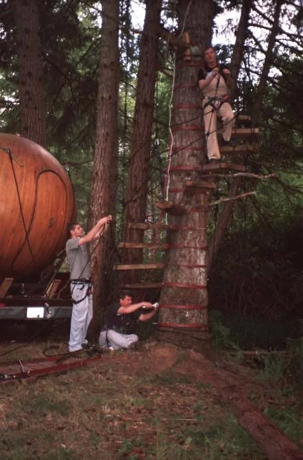 "Climbing the trees is the most difficult yet exhilarating work. Typically it takes a crew of three men a day to get a sphere rigged in the trees. Then it takes several more days to set up the stairway and suspension bridges. The whole set-up comes down in a day and vanishes without a trace.