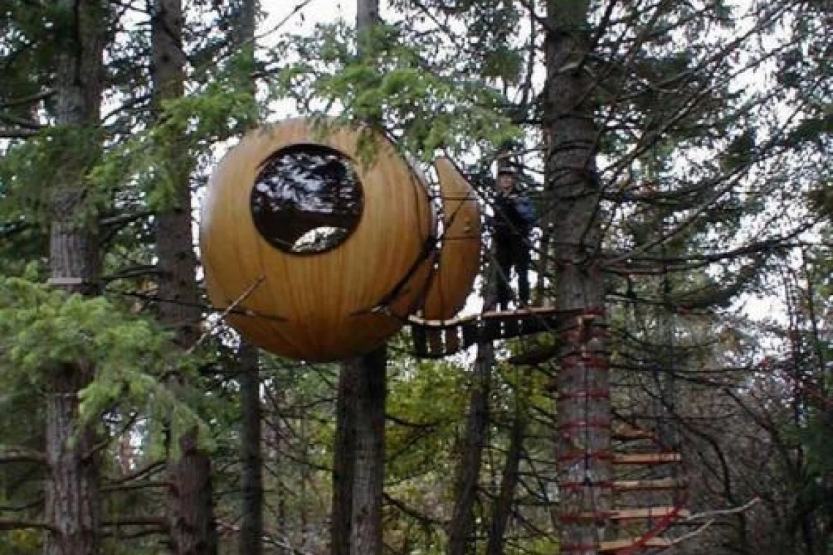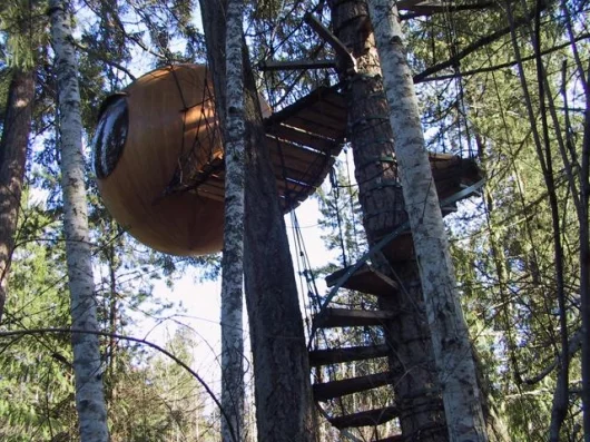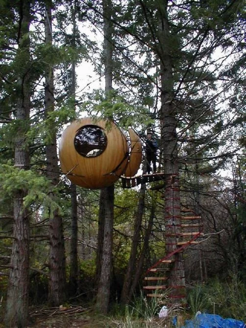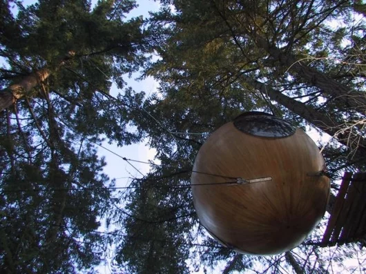 The Free Spirit Sphere is a modern day tree house that borrows heavily from sailboat construction and rigging practice and is designed to allow the user to commune with nature whilst doing as little possible to disturb the natural habitat. Built in Canada, by Tom Chudleigh, the idea of the Free Spirit Sphere is new and still in the development stage.