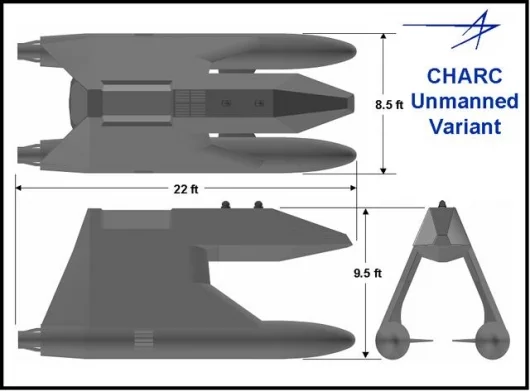 An interesting amalgamation of many Lockheed Martin advanced technologies, the CHARC operates from a larger mother ship such as an amphibious support ship or possibly the new Littoral Combat Ship and responds quickly to changing threats as it supports an assortment of weapon and/or sensor mission modules that can be changed out in a few hours. It also provides limited mine-hunting capability for the detection and destruction of mines it encounters in shallow water.