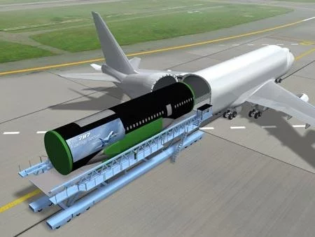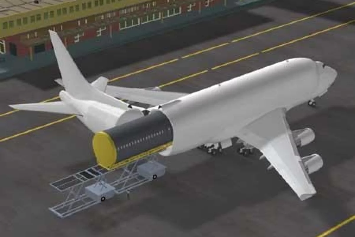 The Large Cargo Freighter's unique design will enable the entire aft fuselage to swing open, allowing 787 fuselage and wing components to be loaded. The expanded girth of the Large Cargo Freighter will hold 300 percent more cargo above the main deck than the largest freighter in regularly scheduled service, the 747-400.