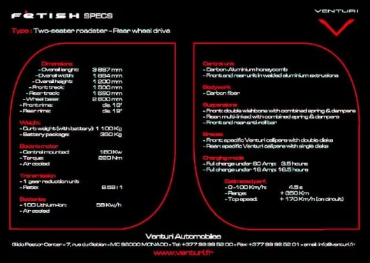 Under the technical direction of Gerard Ducarouge, chief engineer of the project, Venturi has taken a different approach to most other companies in the electric car business in designing the Fetish. Most such vehicles use an electric motor to drive each wheel, whereas Ducarouge has opted for a single centrally-positioned engine and a monocoque carbon chassis, to keep weight to 1100 Kg.