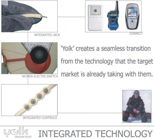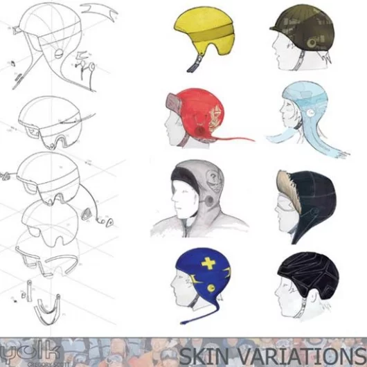 Yolk is a soft helmet designed to overcome the unfashionable image that helmets seem to have with the young-at-heart on the ski slopes of the world. ‘Yolk’ under regular use is flexible and conformable to the user’s head but when subjected to an impact it instantaneously forms a rigid shell dispersing and absorbing the energy . This is achieved utilising a semi- rigid liner and a Kevlar skin which is impregnated with a shear thickening fluid. ‘Yolk’ allows the user to plug in a two way radio, music player, or mobile phone to the integrated headphones and controls thereby creating a convenient and seamless transition. ‘Yolk’ can be fitted with of a choice of skins which can be stretched over the liner to match the user’s personal style. With similar safety standards across bike riding, inline skating, skateboarding, there are vast opportunities to develop different skins for these sports using the same liner.