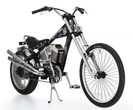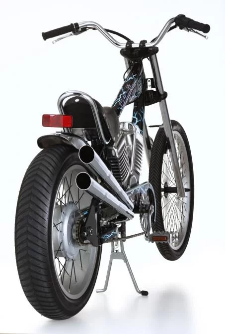 Special features of the electric model include: variable pedal, electric or dual power mode; an on-board computer to make best use of energy; LED throttle indicator of battery condition; removable rechargeable battery; and rear wheel motor mount eliminating chain or belt breaks. Most importantly, the battery pack has been designed to look like the traditional V-twin motor that powers the world's choppers.
