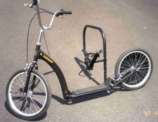 This also simplifies the animal's "choices" and reduces the level of "training" required of the animal. Simply harness the dog and clip them into the frame and off you go. With just a few outings pulling the scooter the dog quickly learns when to slow (by feeling the braking) and which direction to turn by again "feeling" the side pull on the harness. Dogs love it because it takes little "effort" to pull the scooter and they get exercise next to their owner.