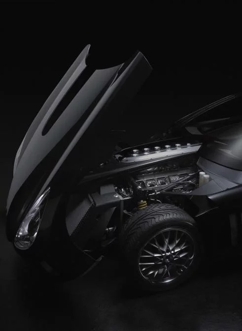 Set into the bonnet, a glazed panel reveals twelve intake trumpets reminiscent of a fairground organ.