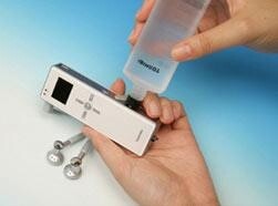 The 100mW unit, similar in shape and size to a pack of gum at a compact W23mm x L75mm x D10mm, can power the flash-based player for approximately 35 hours on a single 3.5ml charge of highly concentrated methanol, the fuel that drives the electricity producing chemical reaction in the fuel cell. The 300mW unit is W60mm x L75mm x D10mm and delivers enough power to keep an HDD-based audio player running for approximately 60 hours on a single 10ml charge.