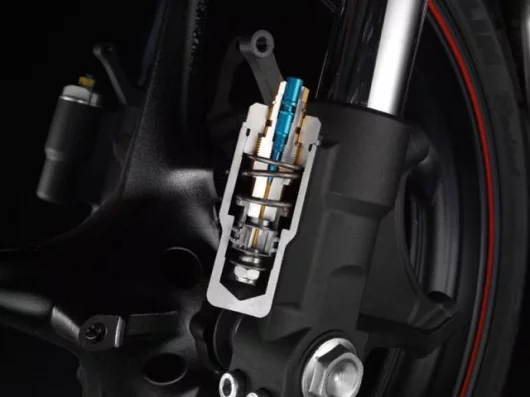 A new type of rear suspension has been adopted to provide the best match with the new frame. The link system for the rear suspension has been changed to a bottom-linked type and the link character has been optimized. Design efforts have been made to contribute to better concentration of mass. As with the front, a 2-way compression stroke damping adjustment mechanism has been equipped on the rear suspension. The damping can be adjusted separately for both high- and low-speed stroke to enable greater choice to accommodate different conditions and uses.