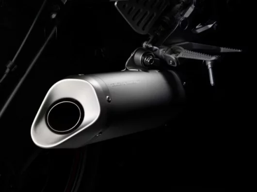 7) Midship muffler and EXUPTo ensure excellent exhaust efficiency, concentration of mass, and aerodynamic characteristics, this model adopts a midship muffler. The design aims to make use of the space behind engine resulting from the shorter front-aft length of the new engine and the long rear arm. It also gives the machine a striking appearance.
