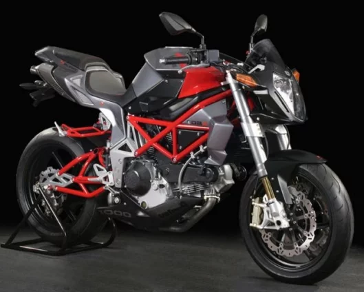 The bike has Titanium-Nitride-coated 50mm Marzocchi forks and double 320mm disks with 4-piston radial calipers.