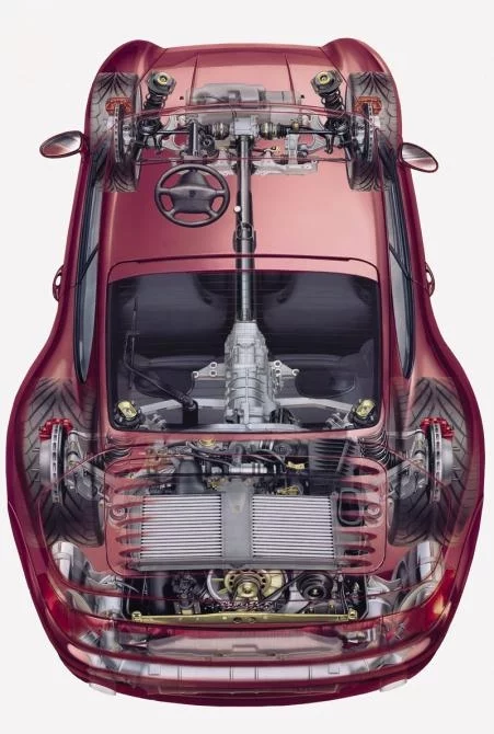 The fourth-generation 911 Turbo made its appearance in early 1995, based on the 3.6-litre power unit carried over from the 911 Carrera. The engine's performance figures, however, now entered a new dimension, with the new power unit featuring a twin turbocharger. So following the Porsche 959 technology spearhead boasting a second exhaust gas turbocharger for the first time in 1987, bi-turbocharger technology now made its way successfully into series production.