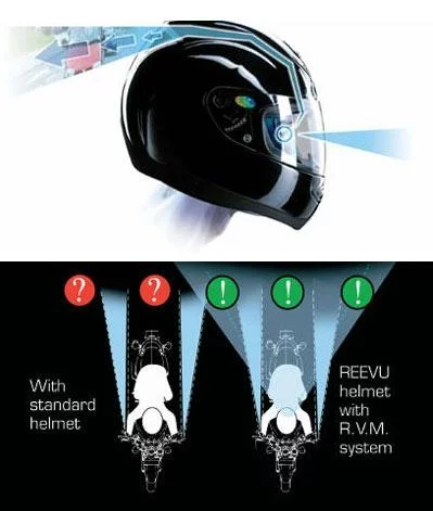November 22, 2005 Seeing behind you on a motorcycle has always been a problem. Sometimes the mirrors vibrate, and sometimes they offer a terrific view of your elbows, and most of the time they offer a distinctly inferior view of the rear compared to that you get in a car because you can’t see the parts directly behind you. As a soldier in combat will tell you, when your situational awareness is down in a hostile environment, the risk of injury multiplies enormously. And hence when a helmet with an integrated rear view mirror system was launched last week in Munich we think it’s worth a look. Manufacturers Reevu spent ten years developing the helmet, which has a built-in 180 degree unbreakable rear-view mirror system in the hope it will save lives on the roads by improving situational awareness and hence preventing accidents. The innovative technology allows the wearer to see the road behind, using a system of unbreakable mirrors constructed out of ABS, which are contained inside the helmet shell and provide a window in the top of the helmet opening – a robust, low cost heads-up display.