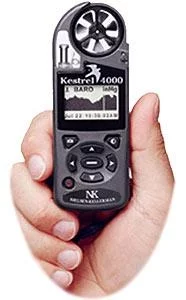 The Kestrel 4000 measures wind speed, temperature, wind chill, humidity, heat stress index, wet bulb temperature, barometric pressure, altitude, dewpoint, and density altitude.