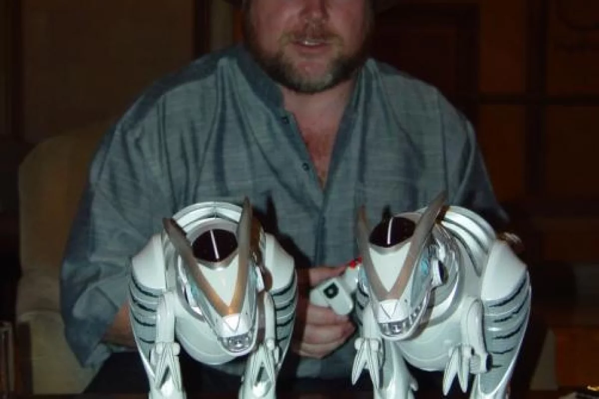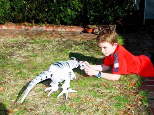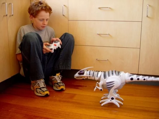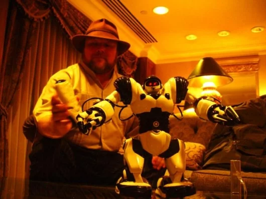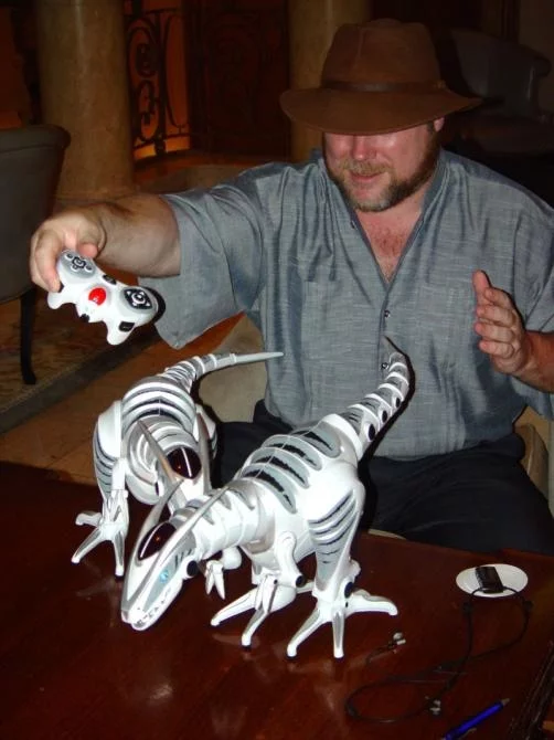 March 23, 2006 To say we think WowWee Robotics has played a pioneering role in the first wave of the consumer robotics revolution is an understatement. Twenty five years from now when the consumer robotics industry is expected to rival the automotive industry in size, Wowwee’s diminutive Robosapien will be seen in the same light as the Model T Ford and the company’s high tech Geppetto, Mark Tilden (pictured with two roboraptors), could well be held in even higher esteem. The price of the company’s “toy” robots belie their capabilities and Robosapien V1 and V2, Roboraptor et al have functionality for which the company could legitimately ask ten times the price – the bargain pricing though has resulted in millions of Wowwee robots being the first to invade the home. The big news is that overnight Evolution Robotics and WowWee announced a strategic alliance to integrate Evolution's ViPR and Northstar technologies into WowWee products. ViPR (Visual Pattern Recognition) provides reliable and fast recognition of patterns, objects, and locations in realistic environments. Northstar, known as "Indoor GPS," is the world's lowest-cost solution for position-awareness for consumer robots, and enables robots to navigate autonomously and intelligently.