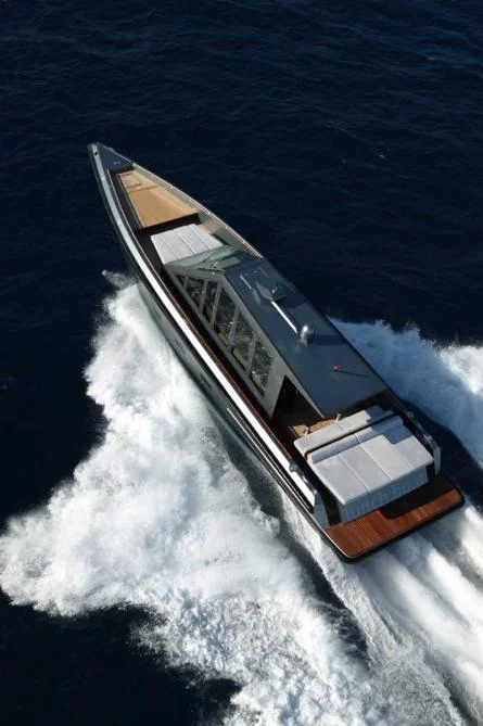 The 21-meter WallyPower 70 comes in two basic models, both with that same distinctive dark glass exterior though one has a fully enclosed glass cabin area and the other is open to the aft transom, with the air conditioning acting as a barrier between the outside and the inside. Both can seat 20 or more for meals, though if it’s party space you’re after, the open version with the “lunch boat” layout is the one to go for, as its deck plan flows seamlessly between three social areas. And if you fancy speed, both boats are powered by two MTU diesel engines generating 3,000 horsepower, pushing the 70 WallyPower’s top speed 47.5 knots half load, and 45 knots full load at continuous duty with a consumption of only 250 litres – 66 US gallons per hour! Extensive photo library of these exquisite motor yachts.