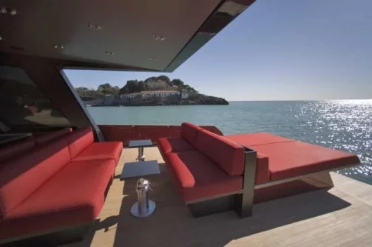 The “lunch boat” layout offers what WallyPower refers to as a “loft on the water.” Of the three different social areas, the forward one is completely under the superstructure, aft the helm station, and can be used for dining or converted into a lounge by removing the table top. The second area is half sheltered by the superstructure and can also be either dining or lounge. The third area is the aft large sunbathing pad.
