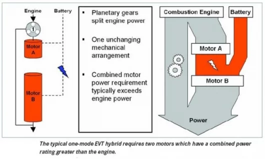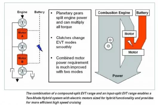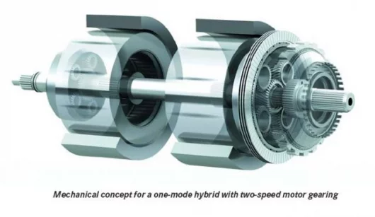 June 19, 2006 Details of the hybrid drive system under co-development by General Motors, DaimlerChrysler and BMW have been released and the new system is quite a technological feat due to the full integration of electric motors with a fixed-gear transmission. As a result of its low- and high-speed electric continuously variable transmission (ECVT) modes, the system is commonly referred to as the 2-mode hybrid. The system also incorporates four fixed gear ratios for high efficiency and power-handling capabilities. During the two ECVT modes and four fixed gear operations, the hybrid system can use the electric motors for boosting and regenerative braking. Traditional “one-mode” hybrid systems typically have only one torque-splitting arrangement and no fixed mechanical ratios. Due to their less capable mechanical content, one-mode hybrids need to transmit a significant amount of power through an electrical path that is 20 percent less efficient than a mechanical path. Working collaboratively, the group has conceived a full hybrid system featuring four fixed mechanical ratios, within the two ECVT modes, to reduce power transmission through the less efficient electrical path. Consequently, the electric motors are more compact and less dependent on engine size.