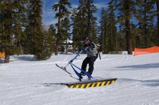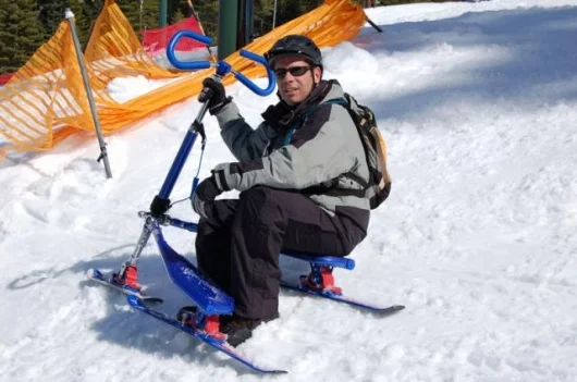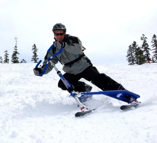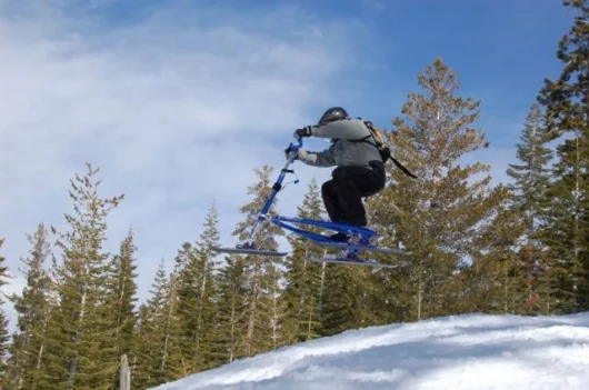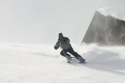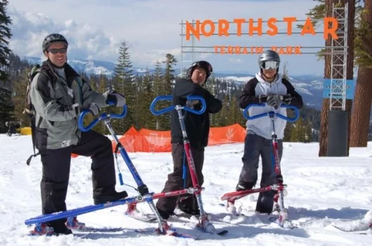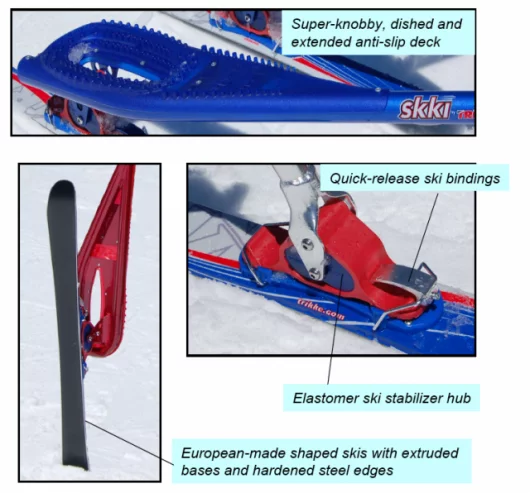 July 18, 2006 Our prize for the best product extension of the year goes to the company that designs and manufactures the three-wheeled cambering Trikke and has now developed a new snow sport from the design and named it Skki. The Trikke is an ingenious human-powered machine that is both chainless and pedal-less. The rider propels the Trikke by slaloming in a graceful, non-impactful fashion, working the torso and arms as well as the legs to generate speeds akin to that of a mountain bike. The best part of the Trikke is the downhill cornering, where the cambering gives it a carving feel akin to that of a racing motorcycle. The Skki is not a logical product extension until you see it, as it offers an identical steering and riding motion that’s just perfect for the snow. There’s some big advantages too – it’s easier to learn than skiing or snowboarding because there’s a set of handlebars for turning, can be done in any comfortable snowboot and hence doesn’t involve any ski-boot pain, it’s 1000 percent less likely to cause a knee reconstruction, and it lacks for nothing in terms of thrills, spills and fun because you can be carving like a pro inside a few minutes! Most importantly, experienced skiers love it too as it’s an entirely new form of snow thrill. Check out the extensive image library.