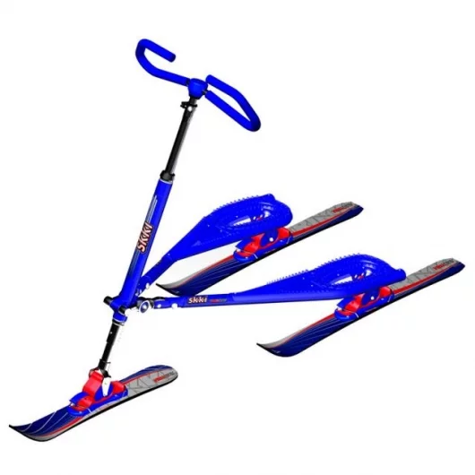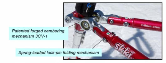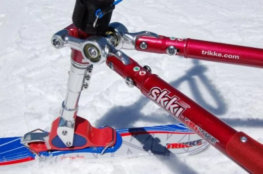 Instead of the Trikke’s wheels, the Skki is equipped with three short carving skis – two at the back under each foot, and one at the front connected to the handlebars which turn and lean at the same time, to naturally and gracefully lead the rider into carving their way across the slope. As the direction and angles of all three skis is fixed by the Skki’s three-point cambering system, everything is kept in line and the machine tracks effortlessly across the snow – carving like a professional skiier made easy.