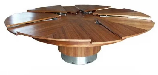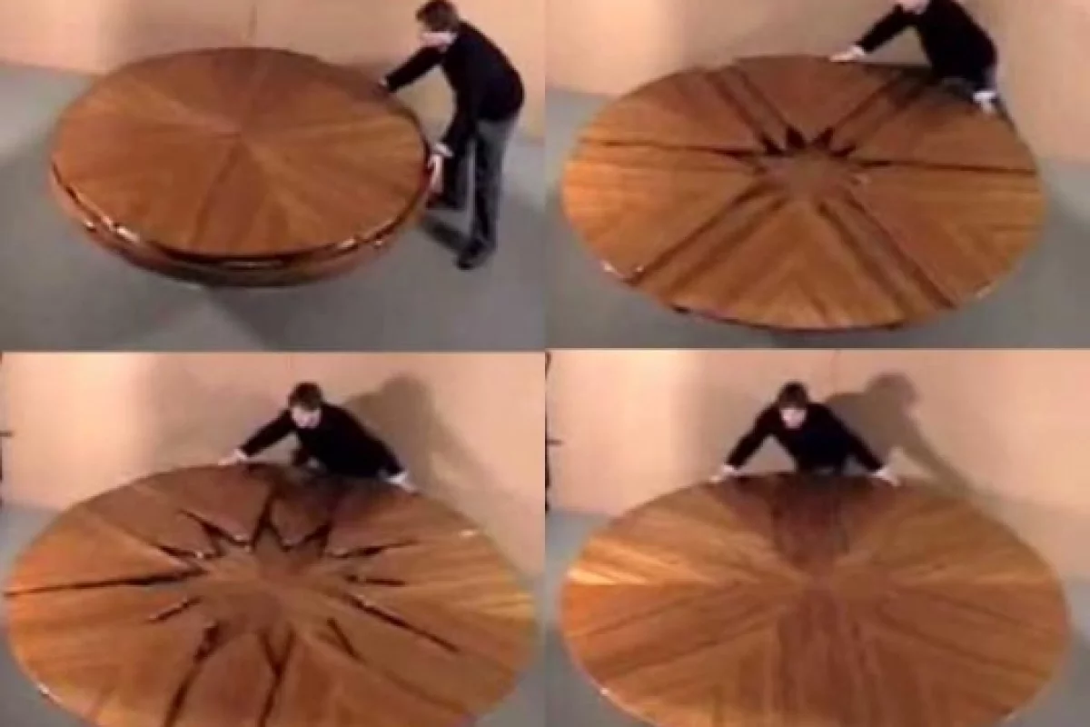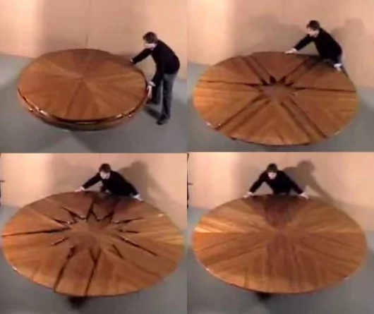 The expansion leaves are stored within the table and, in just four seconds, smoothly and quickly emerge upon rotation, rising and radially expanding outwards as the entire top is turned through 30˚. Existing tables can seat six persons when small, and twelve or more when expanded, but there are other design possibilities.