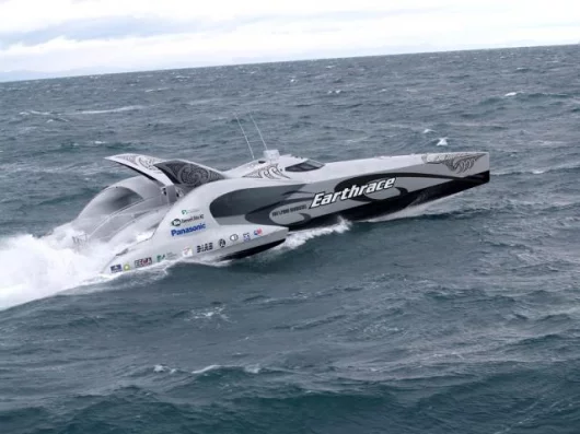 February 16, 2007 Earthrace is a bid to break the 75 day world record for circumnavigating the globe in a powerboat, and using only renewable fuels. Circumnavigating the globe represents the pinnacle of powerboat challenges, and at 24,000 nautical miles, is also the world's longest race. The current record of 75 days was set by British boat Cable & Wireless in 1998 and the most curious aspect is that outright record is still safely held by sail power (The World’s Fastest Catamaran), at 50 days 16 hours. The 1,200 horsepower Earthrace aims to smash the powered record by completing the voyage in less than 65 days, but is unlikely to get near Orange II’s wind-powered record. Wave piercing is a key element in the boat’s design, as it allows the 78ft wave piercing tri-maran to run continuously at high speed in any conditions. Earthrace will begin its record attempt on March 6 and is still seeking US$500,000 in additional sponsorship for its unique attempt.