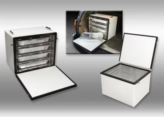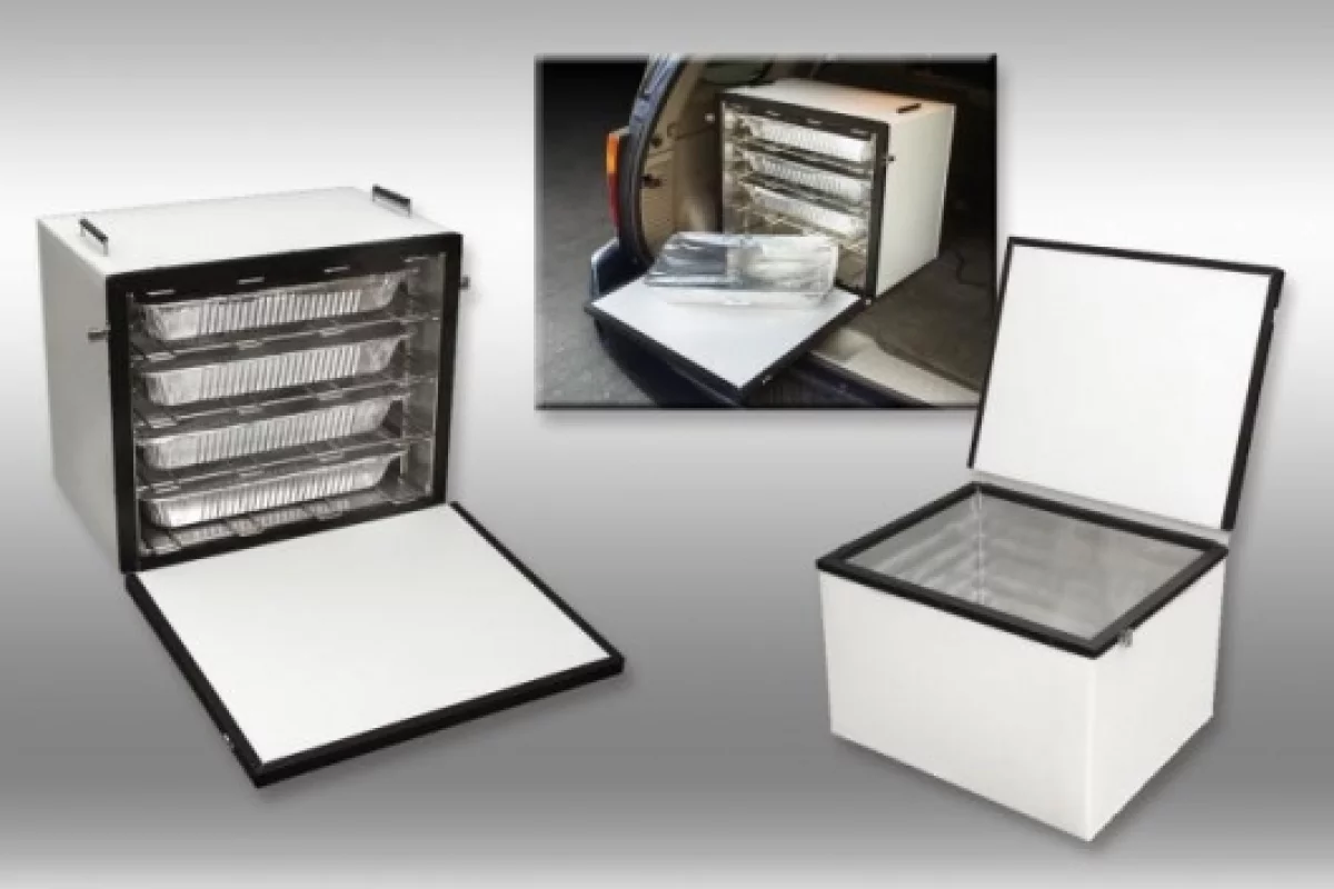 Structural features include rubber “feet” for the bottom of the box, balanced handles, and a lightweight polymer-based corrugated shell. The oven is stackable and can be easily used indoors or out. Logos can be screen-printed on the outside of the box.