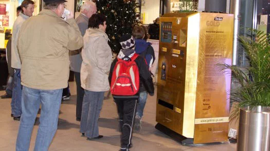The machine is finished in gold leaf, making it a “gold vending machine” in more ways than one. It has all the features of regular vending machines, including a touchscreen, cash and card slots, and an illuminated showcase. To keep it from being used for money-laundering, any one user can only access it three times within 24 hours, and must then take a 48 hour break. For purchases over 1,000 €, a scan of the user’s personal identification is required.
