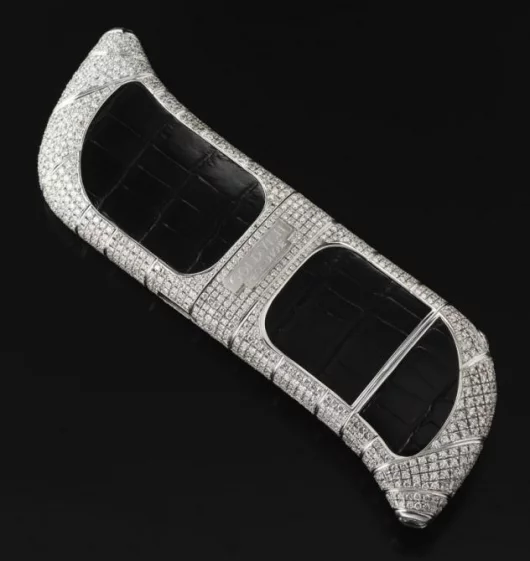 The absolute incredible Masterpiece is a ‘Piece Unique’ of € 1.000.000,- which makes it the most expensive cell phone in the world. It features more than 100 carats of D/E-color and VVS-1 clarity grade diamonds and a guaranteed unique (limited) production, also to been seen in Cannes.