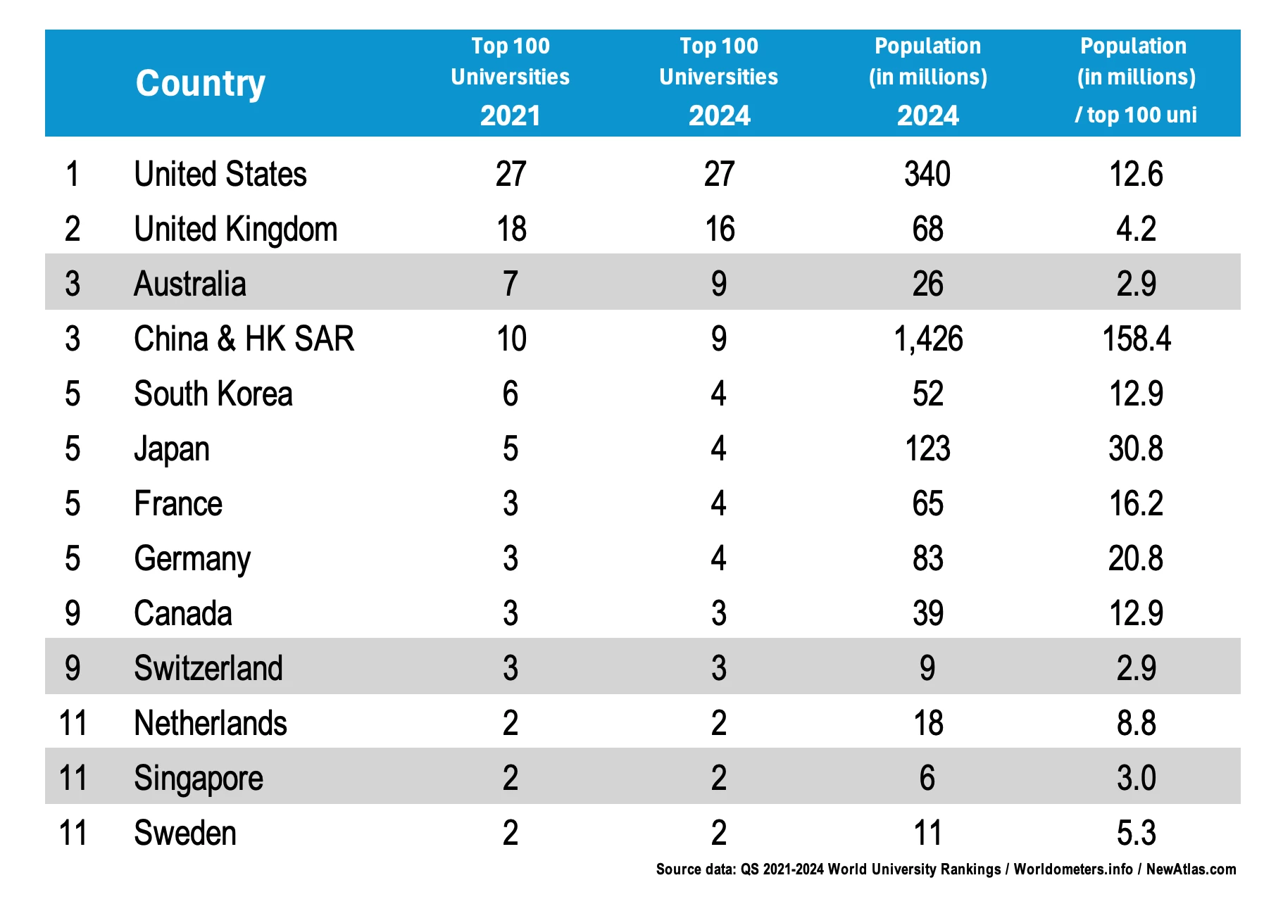 Some countries such as Australia, Singapore and Switzerland obviously prioritise education above all else, but remember this is only one metric (number of Top 100 Universities) and China is investing massively in the education of its people and there will be wholesale change in these rankings over the next few years.