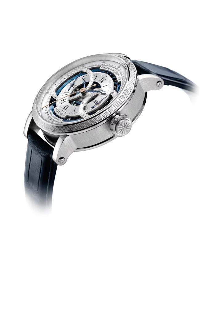 Each watch in the collection is unique - properly unique - not limited edition, false-scarcity unique. Grieb & Benzinger scour the world to collect rare watch movements from the classic age of watch-making (1880 - 1930) by the recognized masters of the art, Patek Phillipe, Brequet, Minerva, Vacheron Constantin etc. The movements are fully restored to working order then skeletonized and hand-engraved using rescued machines from the same period as the movements. Some elements are hand "guilloched" - a form of engraved decoration that hasn't been taught since the 60's. Back surfaces and all screws are "blued" using a special platinum heat process and new skeletonized faces with blued hands are added. The movements are then mounted in new oversized (47-49mm) cases of silver and gold or platinum modeled on the classic Brequet style.