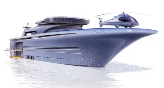 February 15, 2005 Once upon a time, if you wanted to announce your entrance into Monte Carlo, a helicopter on the back of your personal yacht would do the trick. Helicopters on the back of yachts is more common these days - having it lowered into its garage is far cooler. Another "must have" for super yachts looks to be your own personal submarine, that docks into the hull. The Hammer has more than one submarine. It also has large reconfigurable decks, so the toys can be stowed creating oodles of party space with lots of terraces over the sea, and an underwater salon with windows that start above the waterline and extend way beneath it. There are also underwater cameras that can broadcast to the many large LCD monitors throughout the vessel.
