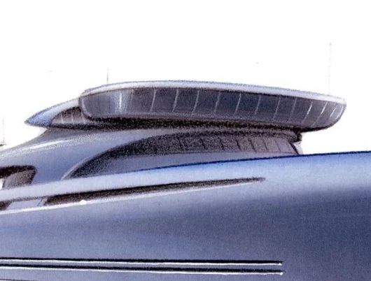 Folding out large balconies are creating terraces over the sea or beach clubs on the sea. Above the wheelhouse a "hammer shape" saloon with large windows turned towards the bow and the sea, give panoramic breath taking views all around.