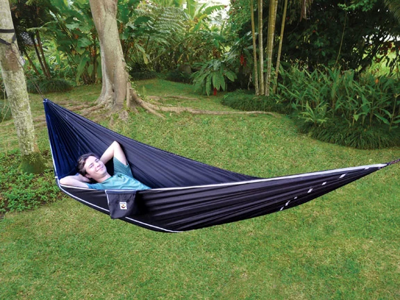 Hammock Bliss creates a flatter surface for sleeping, more similar to a bed or camping mat. It calls the Sky Bed the world's first truly flat two-point hammock and uses an asymmetric design to provide the flat surface for campers to lie down on. The Sky Bed includes a built-in sleeping pad sleeve, which accommodates both foam and inflated pads to add insulation and support.